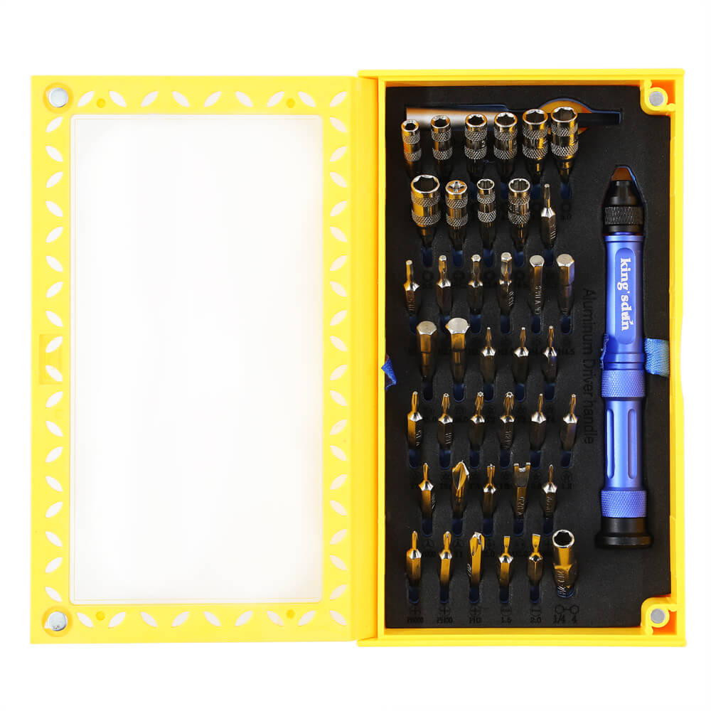 Feature :41 different precise scewdriver bits meet your multiple demandsAll bits are made of premium chrome/ vanadium steel(6150#) with heat treatmentComes with an extension shaft which can be easily inserted into the handle for length adjustmentThe handle has ergonomic design, making your operation