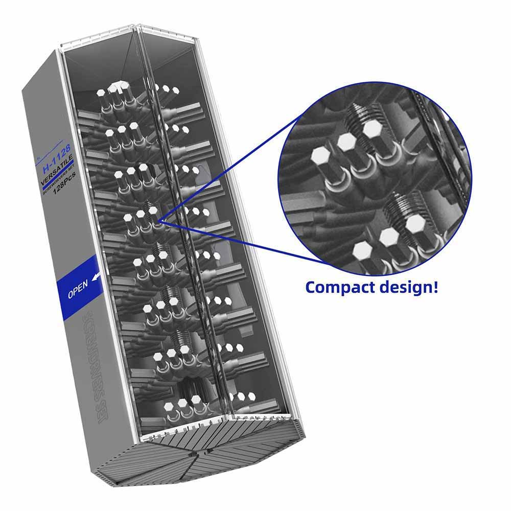 COMPACT WITH CASE DESIGN: Micro screwdriver set uses sturdy material for a unique case design, everything is safely fixed inside and will not fall out, unique housing, is easy to open, and cleverly use of small space to accommodate 128 bits, each screwdriver recess is marked to quickly identify the
