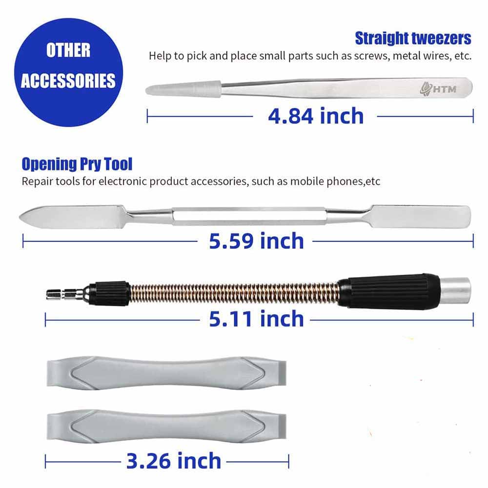 ACCESSORIES: Professional electronics tool kit with ergonomic metal driver with non-slip threads and 360° swivel top, comfortable and easy to grip, including an extension shaft to remove screws in tight locations, and tweezers, suitable for clamping up miniature electronic parts, a magnetizer to increase the magnetic screwdriver drill, easy adsorption of screws, a metal pry bar, used to pry open the host, computer hard shell, and 2 mini pry bar used to disassemble the phone iPad screen.