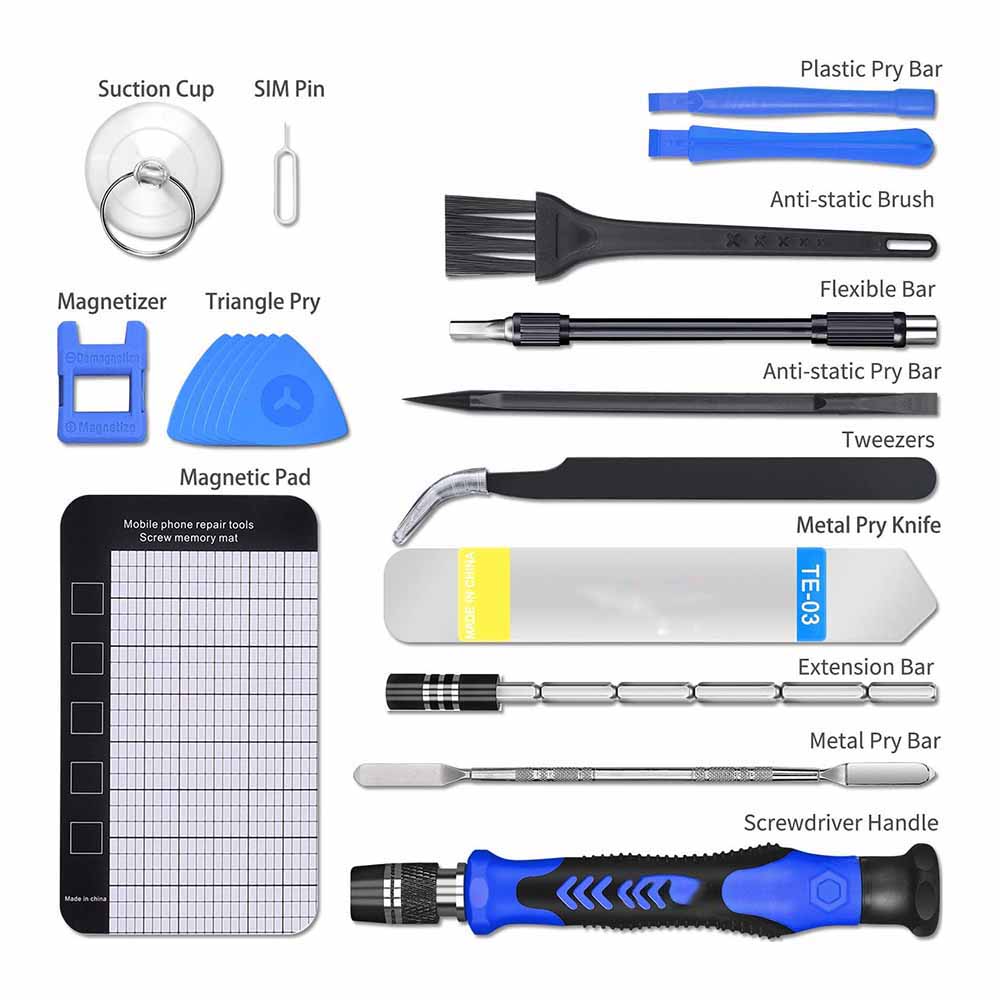 20 Repair Tools: Magnetizer, Magnetic Engineering Mat, Curved Tip Tweezers, Plastic Spudgers, Metal Spudgers, Carbon Fiber Plastic Spudger, Scraper, Triangle Opening Pry Tool, Fiber Cleaning Cloth, SIM Card Ejector Pin, Cleaning Brush, and LCD Suction Cup, etc.