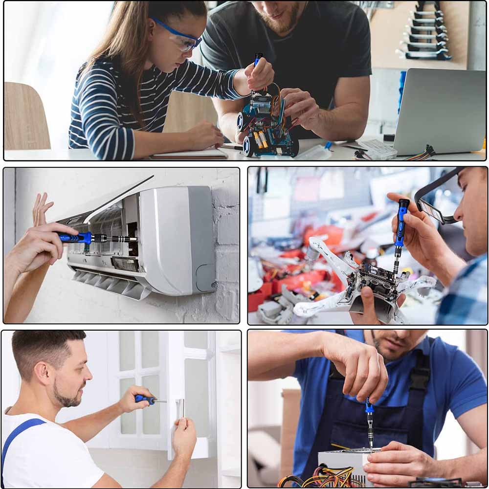 【Humanized Design】 This computer screwdriver kit, The screwdriver handle adopts a push-type design. The soft rubber is non-slip and increases the torque. The head has a built-in strong magnet and is stable. The 360° rotating design at the tail of the handle, with no slippage, can be operated with one hand. The extension rod can be extended by 5 sections and the length is 75mm, Softness extension rod can rotate 360° and bend 180° Can help you easily deal with a complex disassembly environment.
