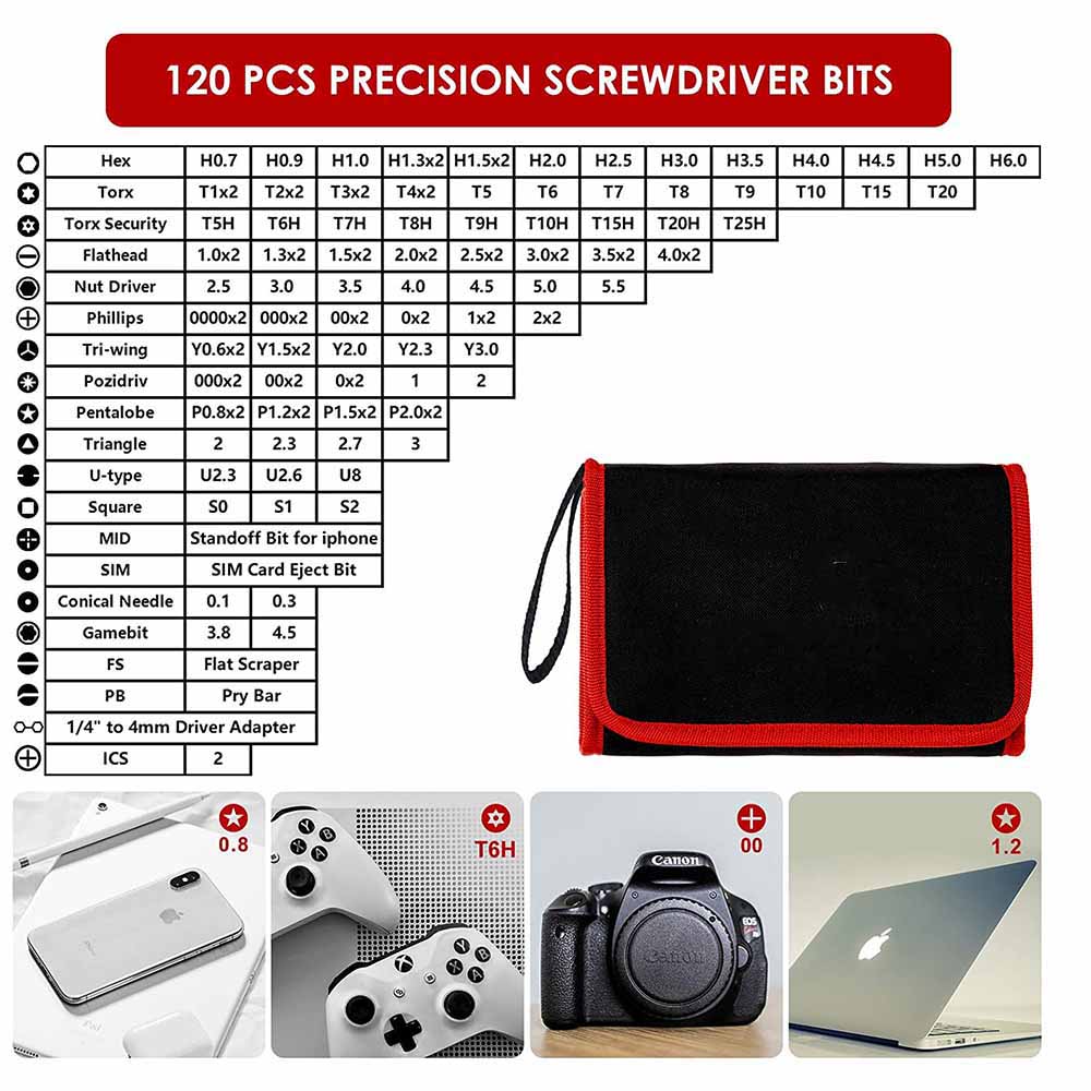 120 Precision Bits: Phillips, Flathead, Torx, Tamper-Resistant Torx, Pentalobe, Pozidriv, Tri-Wing, Hex, Gamebit, etc.