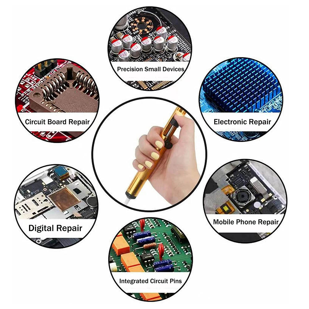 It is mainly used to remove tin when disassembling electronic components on circuit boards. The internal solder suction spring is designed with recoil to instantly strengthen the suction force.