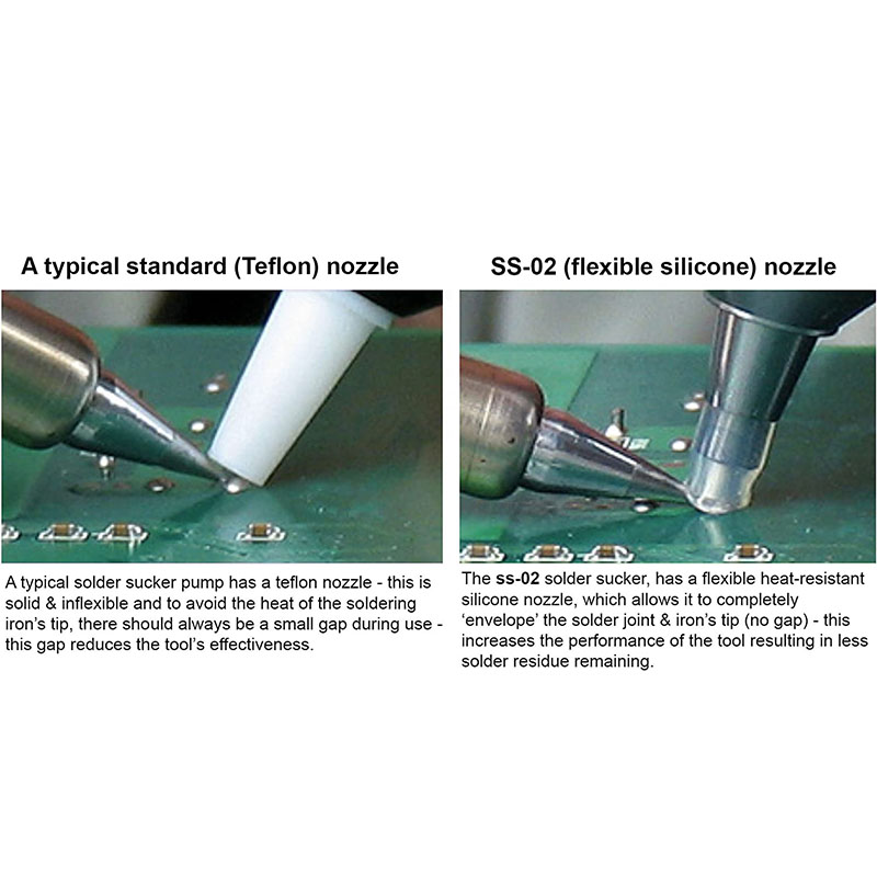 The solder sucker has a large capacity cylinder and silicone tube at the tip for improved suction