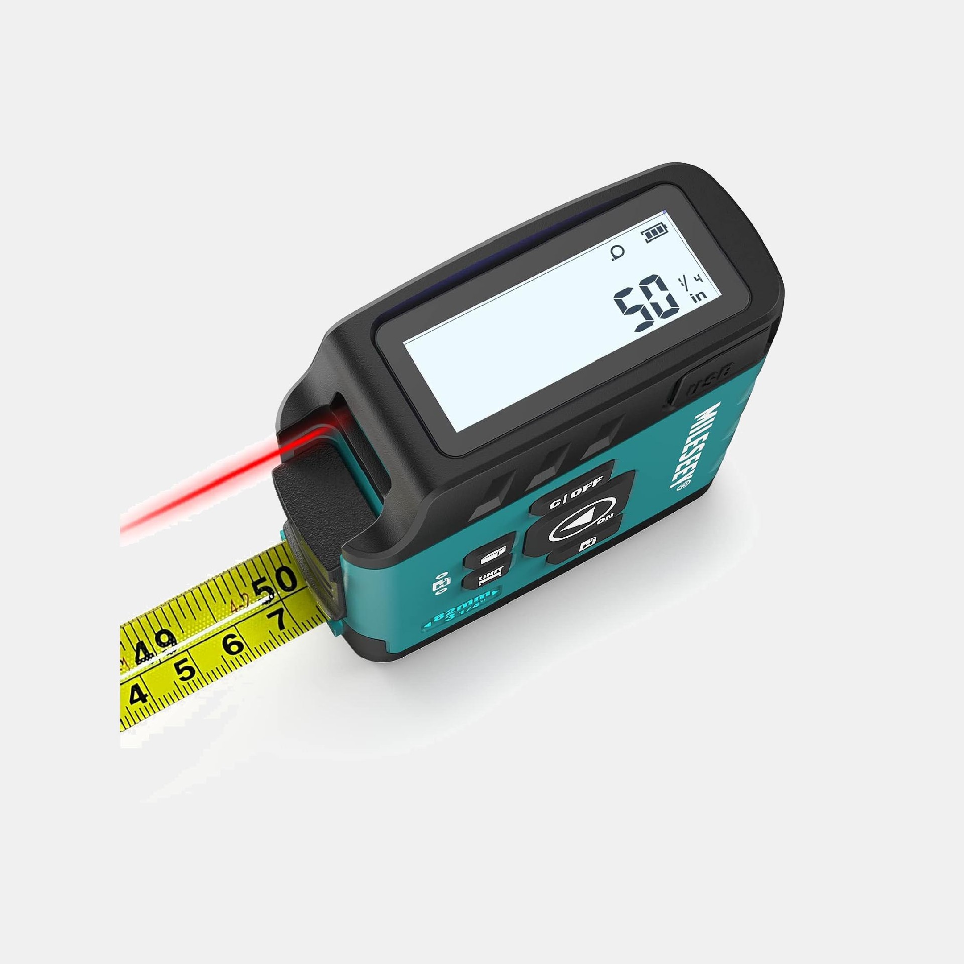 A jobsite ready digital tape measure with laser distance meter, Tape Measuring, and real-time display of tape measure or laser measure data on a 2.0" backlight LCD Screen.