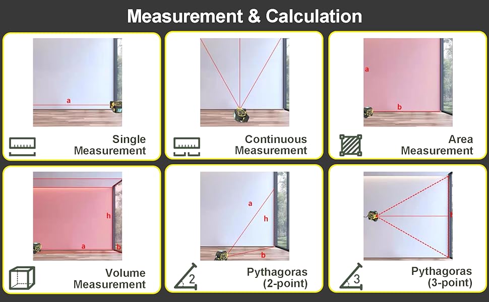 【High-precision 6 Laser Measure Modes】Laser tape measure Ensures accuracy within 1/8 inch, includes Distance, Continuous, Area, Volume, and Two Pythagorean Methods. Additional features include Calibration, Reference Change, and Unit Setting. Automatic shutdown if no operation within 180 seconds.