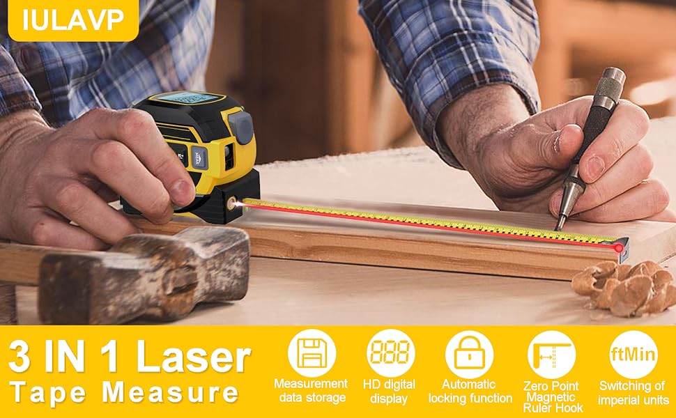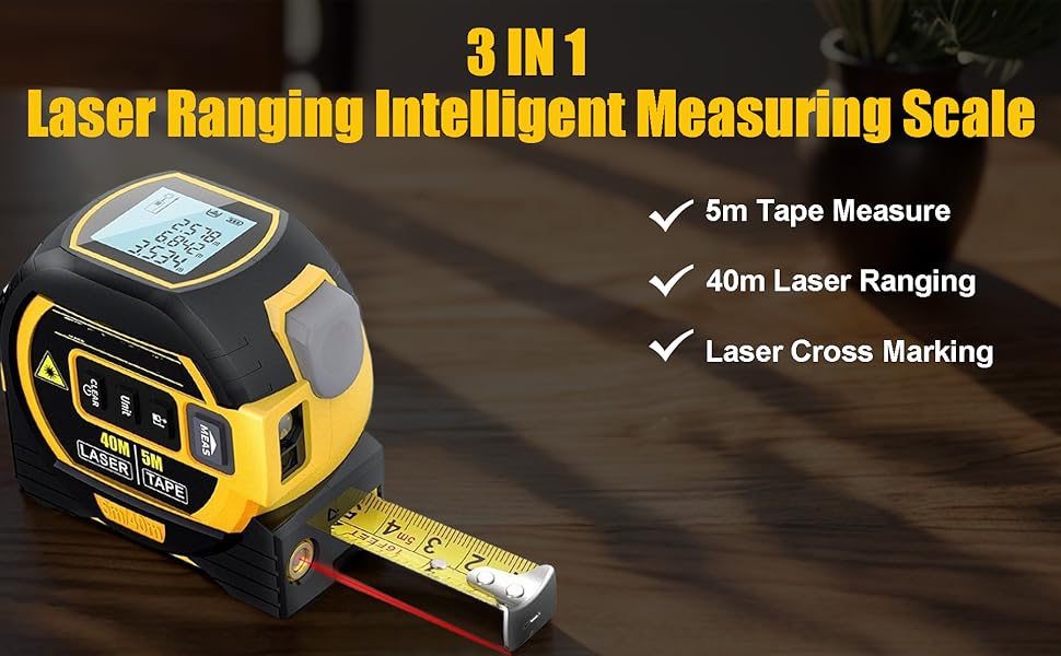 【Versatile 3-in-1 Laser Tape Measure】The laser measuring tool size is 3.15*3.35*1.77in. The digital measuring tape combine a 135Ft laser measure and a 16Ft tape measure, Laser cross marking. 3 in 1 digital laser tape measure ideal for measuring larger areas, such as rooms, apartments, buildings, factories, and warehouses.Class II laser product, output<1mW