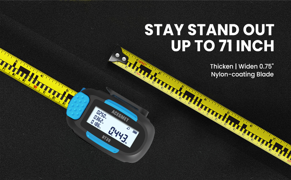 [Built to Last in Any Environment] Crafted with durability in mind, the digital laser tape measure boasts a rugged construction designed to withstand the rigors of any job site. The nylon-coated blade resists rust and wear, while the True-Zero end hook ensures consistent accuracy, whether you're working in metric or imperial units. With a standout of 71 inches, you'll have the reach you need to tackle even the toughest projects with confidence