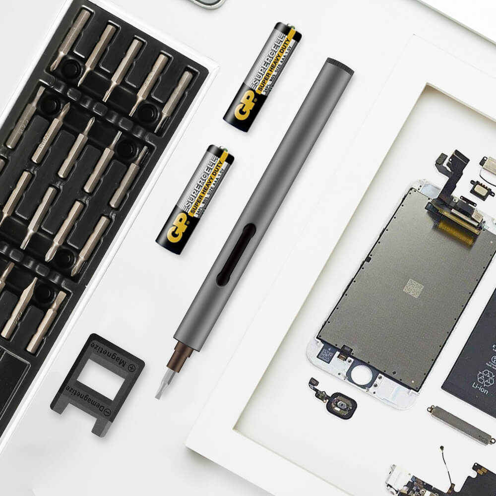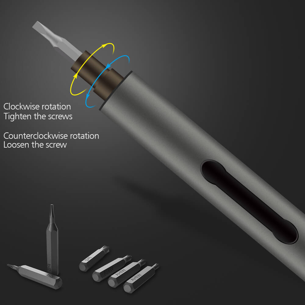 Mini portable electric screwdriver set.Slim aluminum alloy housing with pen-shape design.Works continuously for 3 –5 hours.Manual/automatic mode with 0.12/3N.m torque.Includes 20Pcs S2 steel screwdriver bits.Great tool for repairing projects, such as smartphones, cameras, RC drones, laptops, etc...