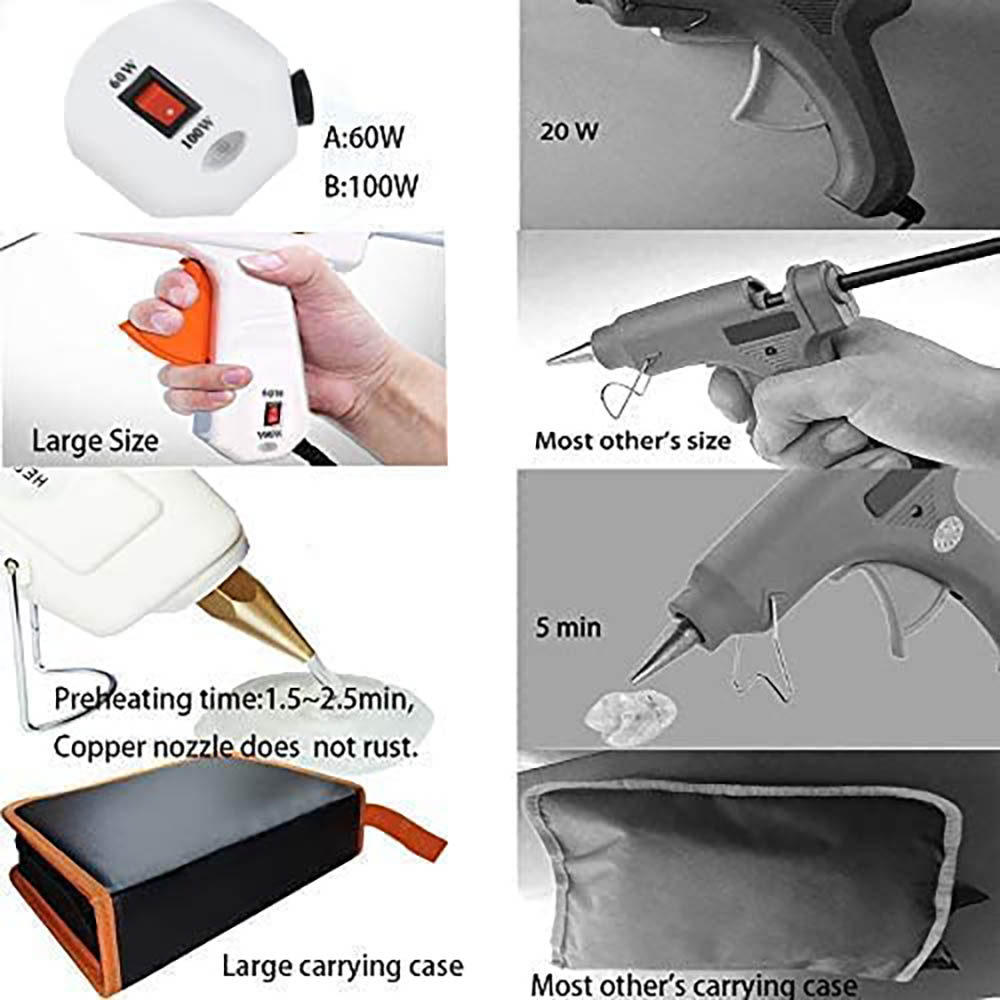 【Rapid Heating +Unique Dual Power 60/100W】This hot glue gun set heats up in 1-3 minutes,two power settings (60 watts and 100 watts) are handy and make it not only work well for arts and crafts jobs, but also suitable for professionals and industrial works.