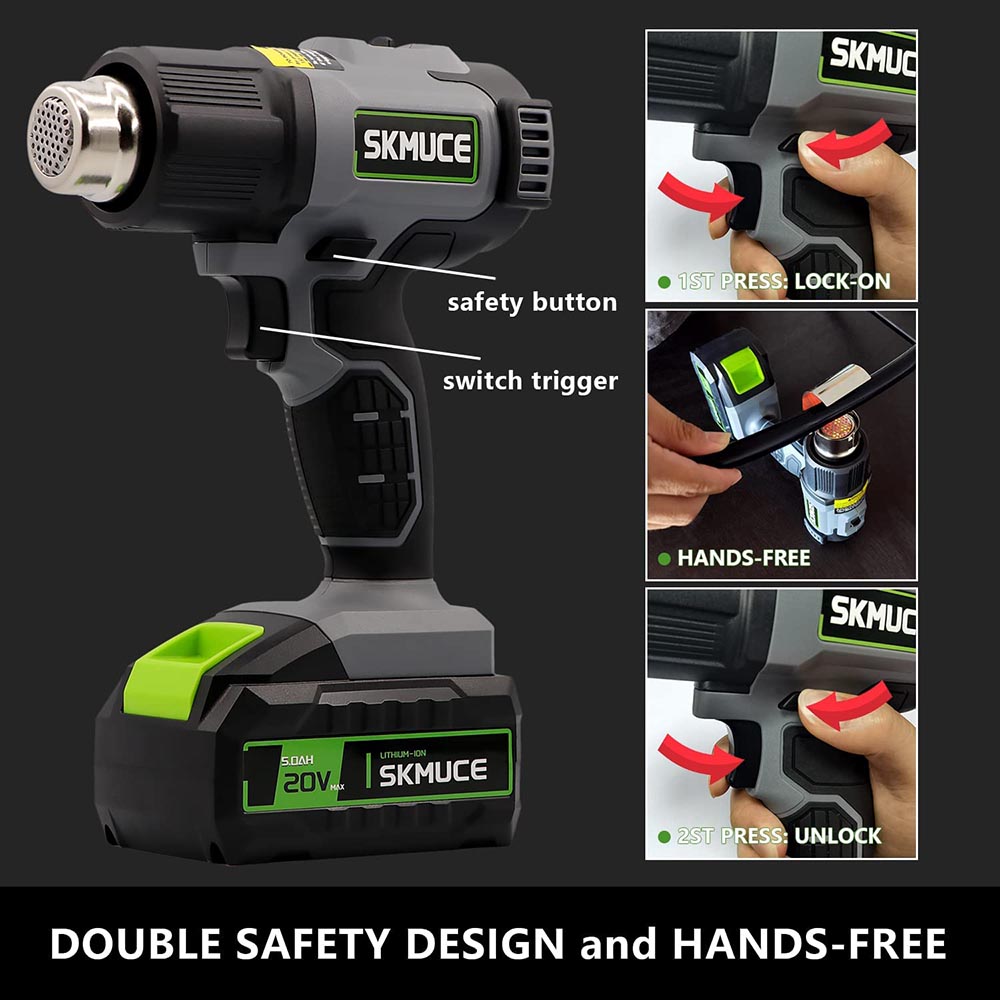 ✔【Strong power & Fast Heating】:SKMUCE wireless heat gun delivers a high temperature of 532℃/990℉ for a variety of spot jobs, reaching an operational temperature in a matter of seconds, ideal use for shrink, wrapping, crafts, paint removal, electronics repair, and so much more.