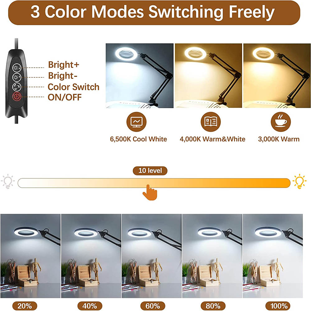 💡【Color Light&Brightness】Cold white light/Warm Light/White and Warm Mix-3 colors can be freely switched, 10 levels of brightness can be adjusted by buttons(10% - 100%). Choose the most suitable light source according to the environment and needs, provide perfect amplification effect for lovers of manual manufacturing, puzzle, painting, embroidery, manicure,etc.