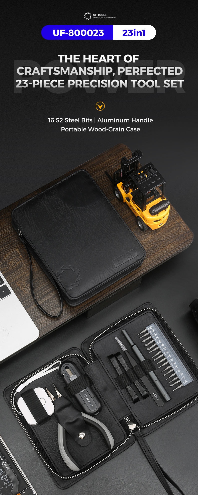 Discover the UF-TOOLS 23-in-1 Precision Tool Set — crafted with 16 S2 steel bits, a premium aluminum handle, and a portable wood-grain case. Reliable manufacturer and supplier for high-quality precision tools and repair kits. Ideal for electronics, watches, and DIY projects.