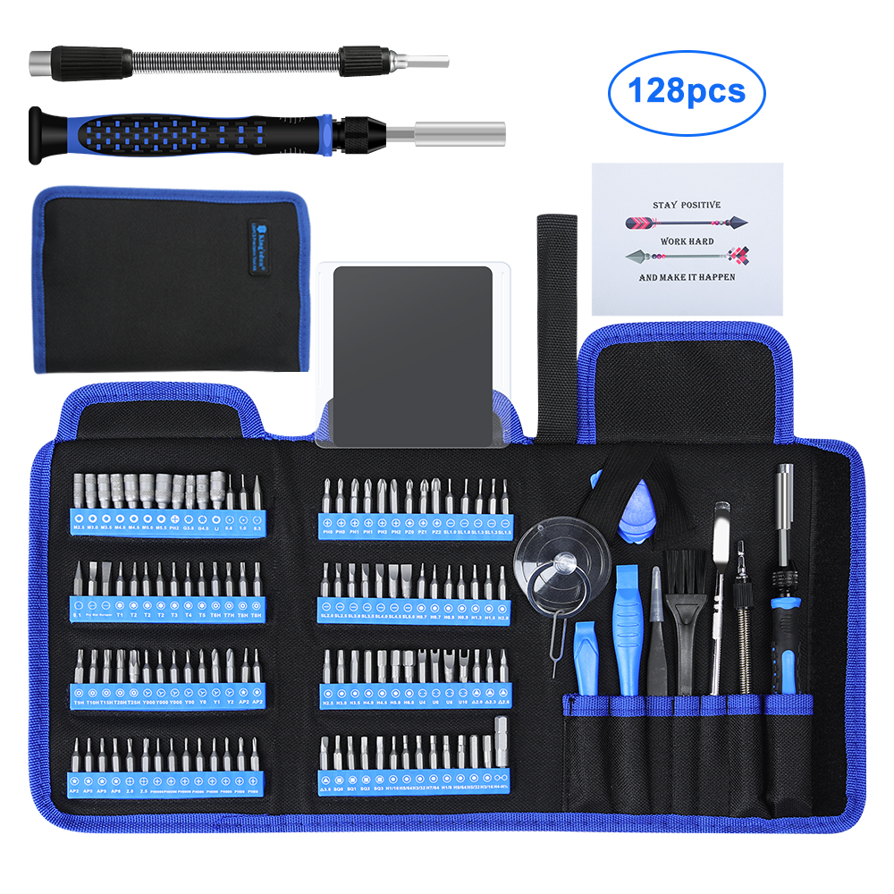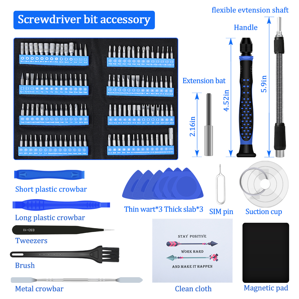 126 in 1 screwdriver set have more tools, which include 112 specialty bits, screwdriver handle, opening tool,tweezers,flexible shaft, SIM card ejector pin and LCD suction cup, cleaning brush and cloth.Screwdriver bits are made of chrome-vanadium steel, durable and applied.