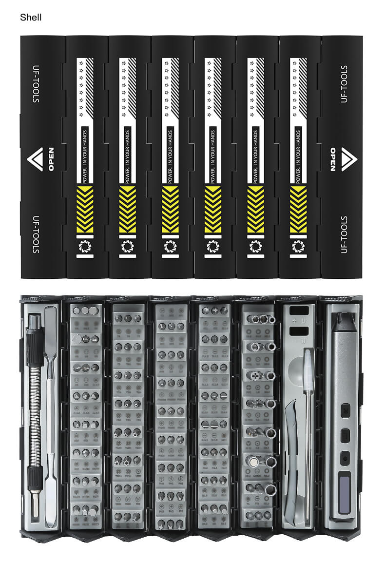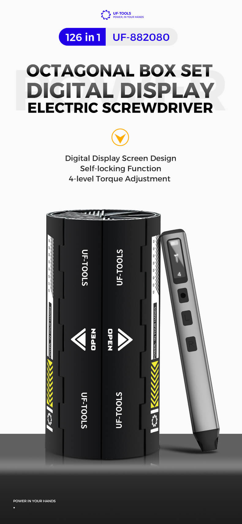 xplore the UF-882080 126-in-1 Electric Screwdriver Set with digital display, 4-level torque adjustment, and self-locking design. Packed in a stylish octagonal box, it’s your ideal solution for precision repairs, electronics, DIY projects, and more.
