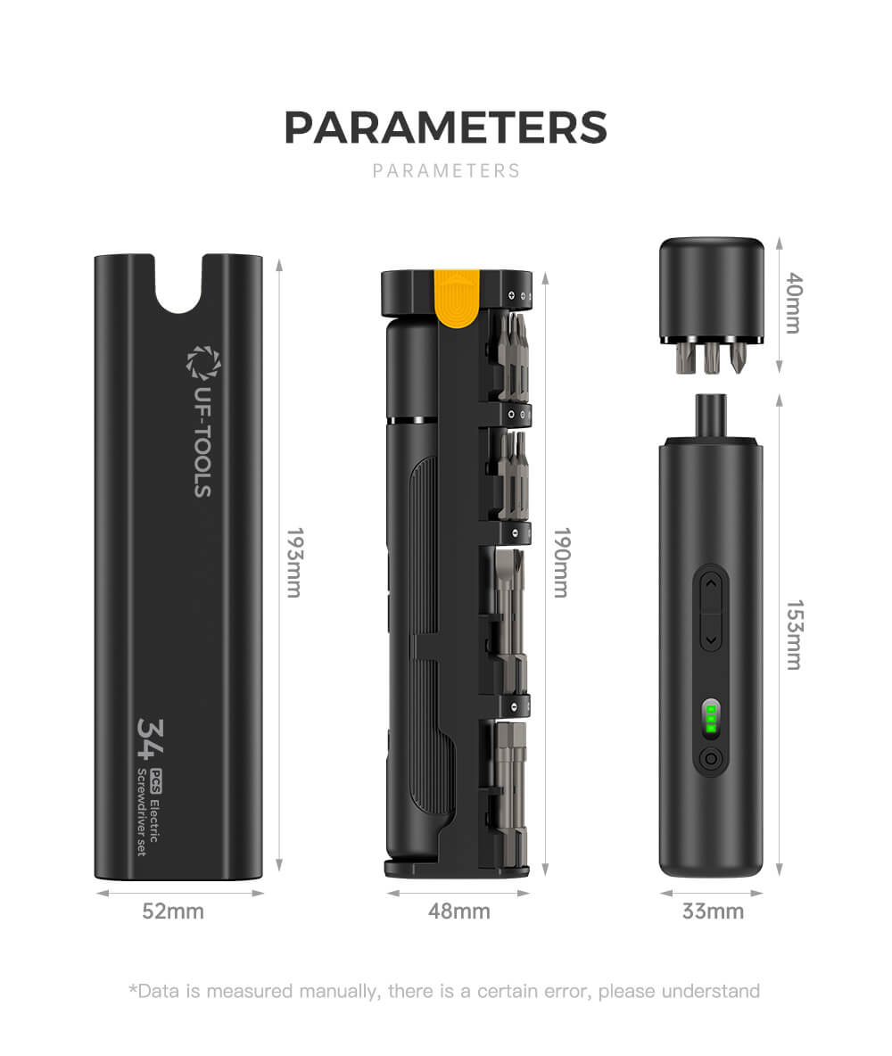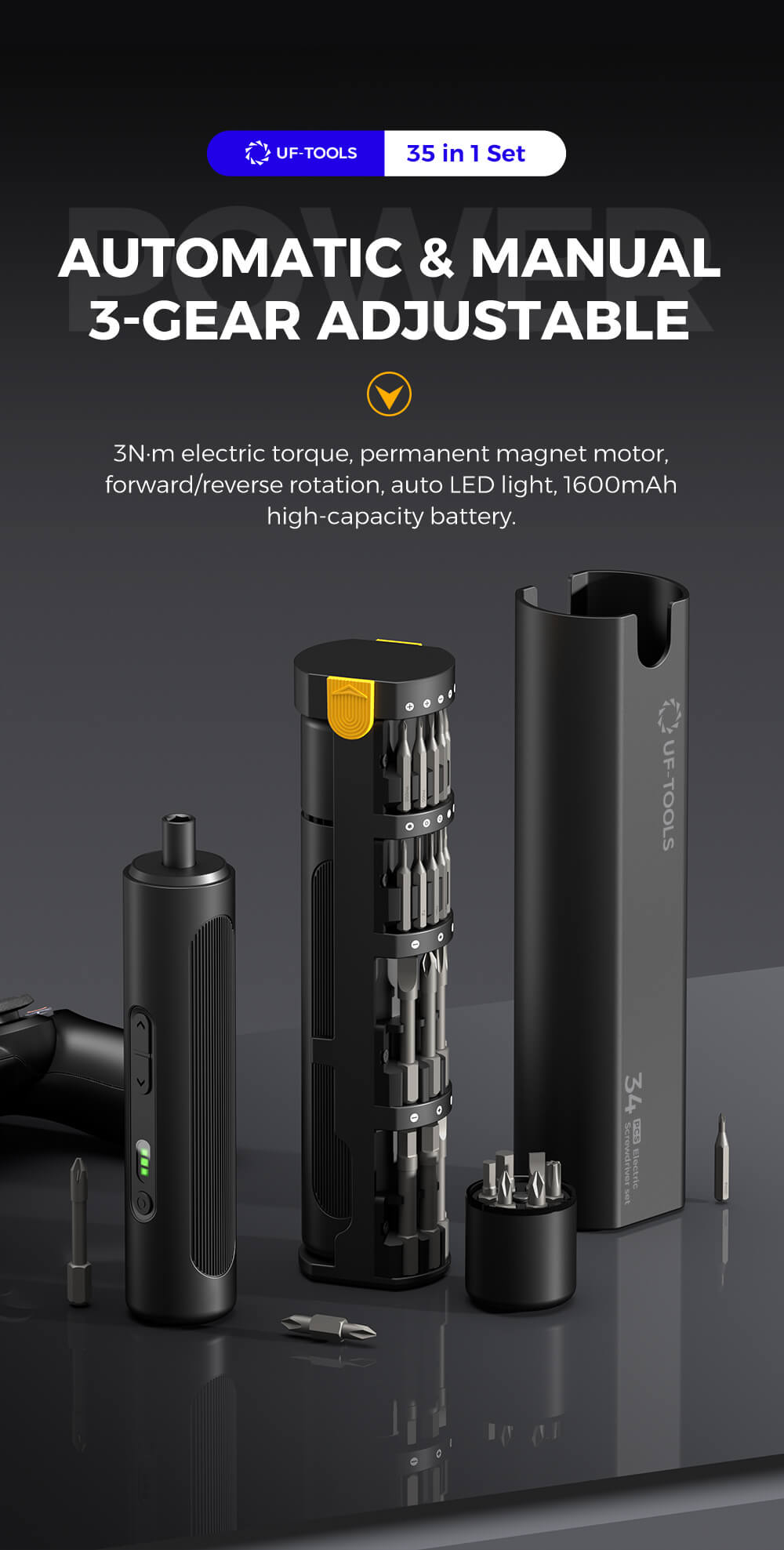 Experience the UF-TOOLS 35-in-1 Precision Screwdriver Set with automatic and manual modes, 3 adjustable torque levels, 3N·m electric power, LED lighting, and a 1600mAh battery. Ideal for electronic repair and DIY use.