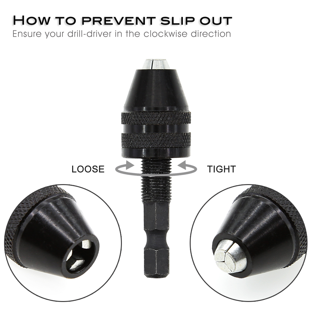 100% Brand New and High Quality.Easy to use and install.Conveniently, safely & quickly.Easily locks onto and releases drill bits.Allows hex drive power tools to use conventional drill bits.