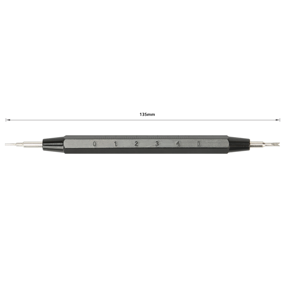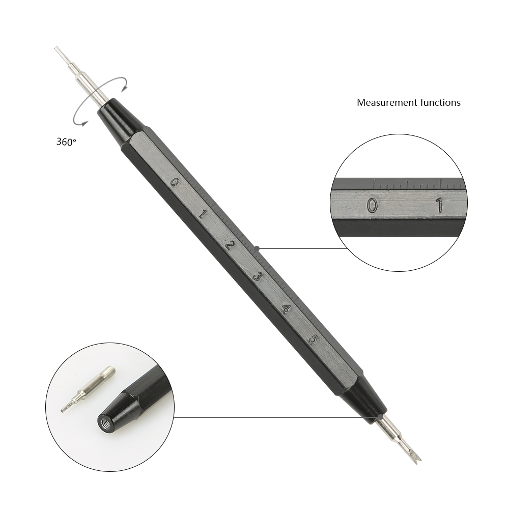 One end has a v-edged flat tip, the other has a forked tip that can be switched to a point tip.It is great for easily fitting and removing spring bars and watch band lugs.The handle is knurled for a non slip grip, besides, it is with graduation.