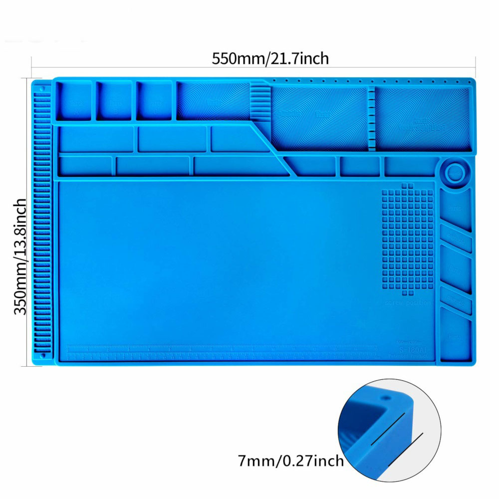 Resistance to high temperature of 500 °C.Sevaral hole locations for setting screws, IC chips and small parts.Built-in scale ruler (0 ~ 36 cm ) on bottom section.Make your repair work easy.A good partner for hot air gun.